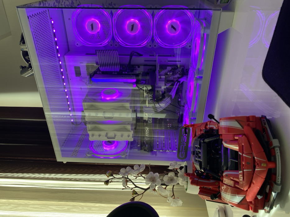 The scene depicts an indoor desk setup in Silistra, Bulgaria. A white computer tower, featuring a transparent side panel, occupies the right half of the frame. The interior of the computer tower is illuminated with a consistent purple LED light, showcasing multiple circular fans (three on the side, three on the bottom), a white dual-tower CPU cooler, an MSI GeForce RTX graphics card, and a horizontal LED strip along the top. A dark "GRISS" emblem is visible on the bottom interior panel. Headphones rest on the top of the computer case. In the foreground, on a white, reflective desk surface, a detailed red model car, resembling a Ferrari FXX K Evo, is positioned centrally. To the left of the computer tower and behind the model car, a small pot holds a branch with white artificial blossoms. A dark mouse pad is partially visible in the bottom right corner. The background reveals light-colored vertical blinds or curtains behind dark wooden window framing.