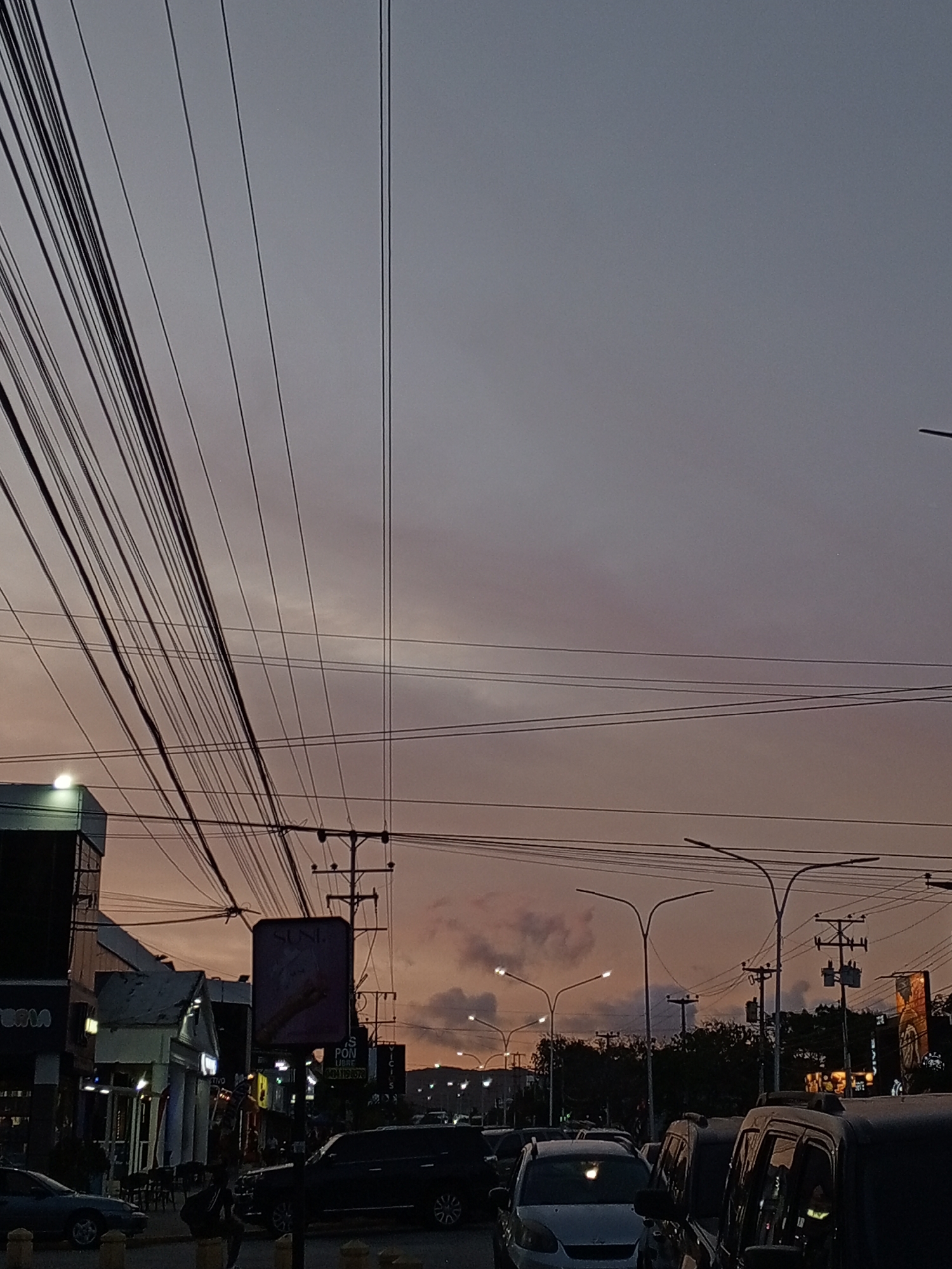 A street scene in Pampatar, Venezuela, at dusk. Overhead power lines intersect the sky. Buildings and businesses line the left side of the street. Parked cars fill the right side and center of the street. Streetlights illuminate the area. A few people are visible on the sidewalk.