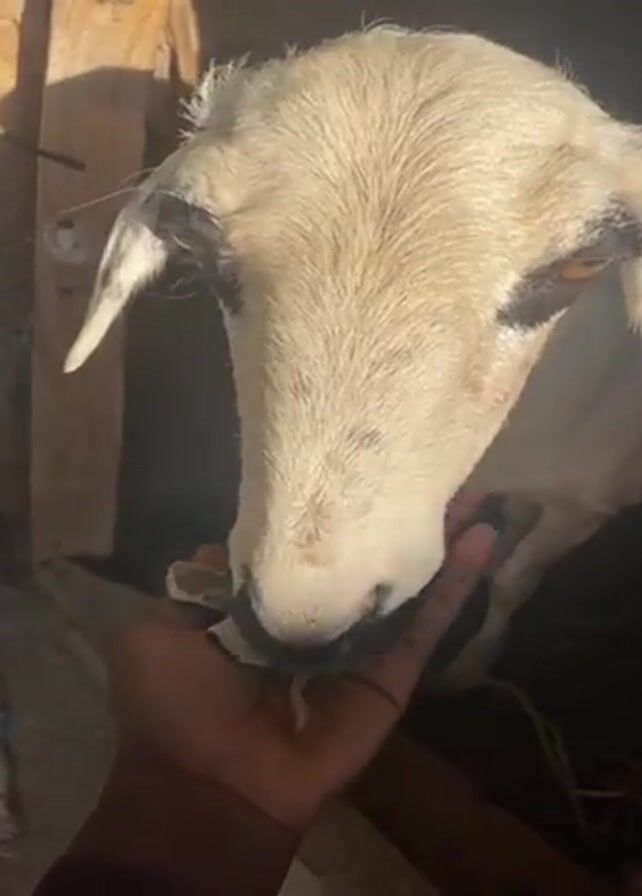 Here's a detailed description of the video: A person's hand, with dark skin, holds a few small, white, dried objects. The hand is positioned in front of the head of a light-colored goat. The goat's fur is primarily white with some darker markings around its eyes. The goat appears to be eating from the hand, focusing its attention on the items being offered. The goat is inside what looks like a wooden enclosure. Parts of the enclosure are visible in the background. The light seems to be coming from above, casting shadows in the enclosure.