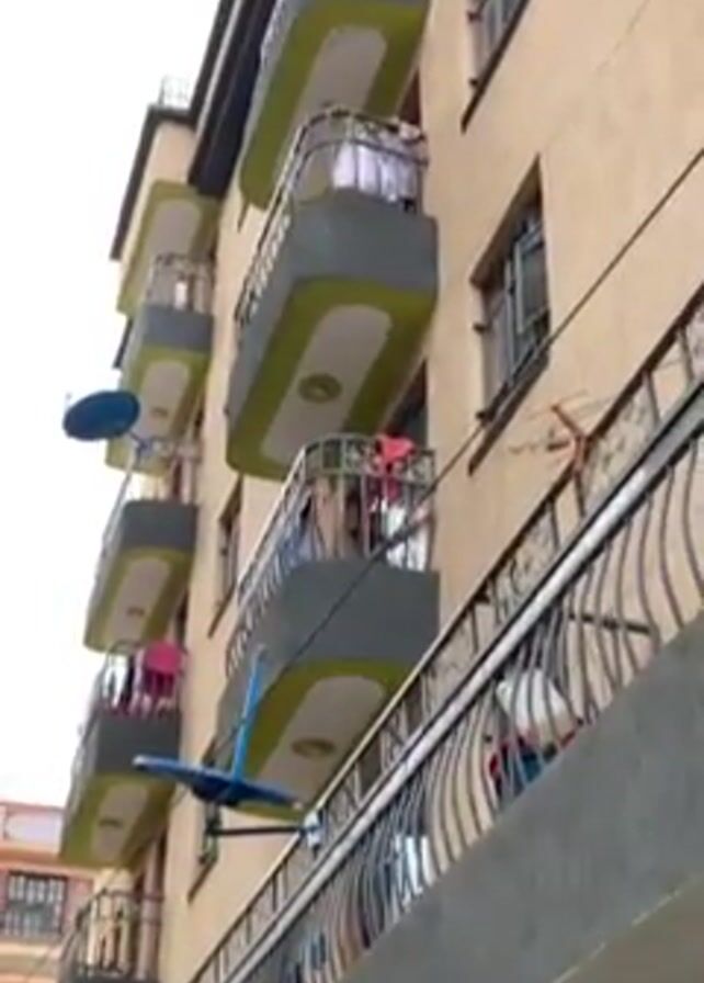 exterior of a multi-story apartment building. The building has a tan facade with a series of balconies painted in a combination of light green, gray, and cream colors. The balconies have decorative metal railings. Several satellite dishes are attached to the side of the building. Clothing is visible hanging on some of the balconies, likely drying. The sky is overcast. The camera angle looks upwards, focusing on the height of the building.
