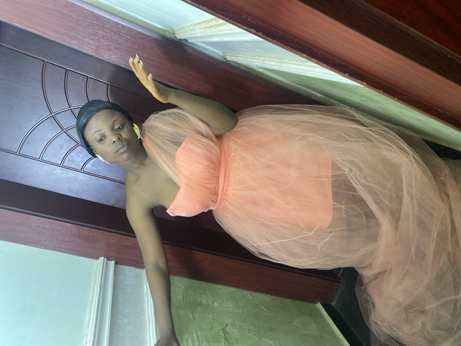 The scene is set indoors in the city of Lafia, Nigeria. An adult female stands in a pose for a photograph. She has dark skin and dark hair styled back from her face. She wears a light peach-colored, one-shoulder gown made of layered tulle fabric, featuring a strapless bodice on one side and a draped sleeve on the other. Her left arm is extended horizontally, resting against a light teal-green painted wall with a white decorative molding. Her right arm is bent, with her hand raised near her shoulder, fingers splayed. Her right palm and fingers exhibit a yellowish stain. She wears light-colored earrings and has long, white-painted fingernails. The background includes a dark brown wooden door or paneling with an arched decorative pattern on the right, and a glimpse of a light-colored curtain or window frame further right. The floor is dark-tiled.