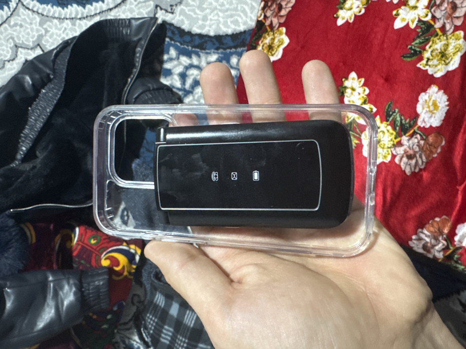 A fair-skinned human hand, positioned on the left, holds a clear plastic smartphone case. Inside the case, a black, closed flip-phone style device is visible, oriented vertically. The device's external screen displays three white illuminated icons: a phone receiver at the top, an envelope in the middle, and a full battery indicator at the bottom. The device has a subtle silver-colored border outlining its front panel. The background consists of a cluttered assortment of fabrics: a dark, possibly leather, jacket and a dark, plush garment are in the upper portion, while a plaid fabric is partially visible on the left. The lower right background features a vibrant red fabric with a repeated pattern of white, yellow, and light brown flowers with green leaves. Overhead lighting illuminates the scene. Location: Unknown, Unknown.