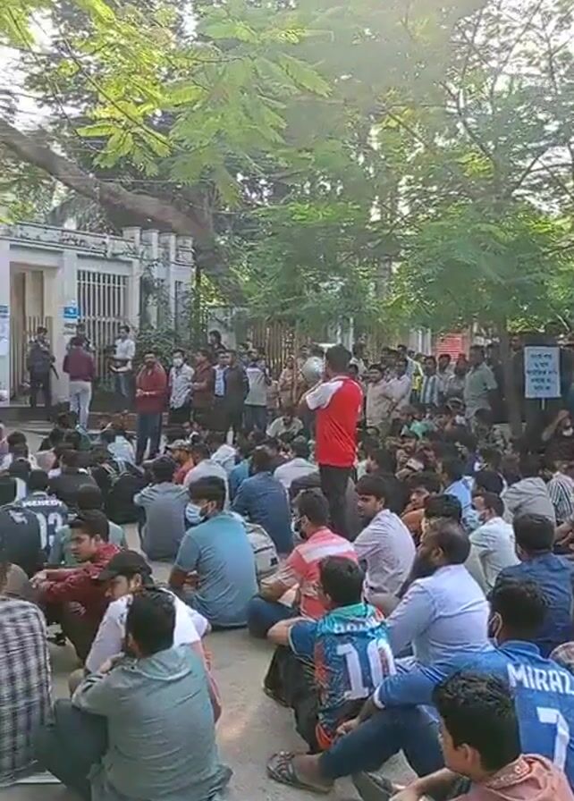 A group of people are gathered in an outdoor area, some sitting on the ground and others standing. A person in a red shirt stands and speaks to the group using a megaphone. A sign is visible in the background. In the distance, a line of law enforcement personnel wearing riot gear is stationed near a building entrance. Trees surround the area.