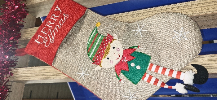A Christmas stocking is displayed vertically, hanging on a light-colored wooden slat structure