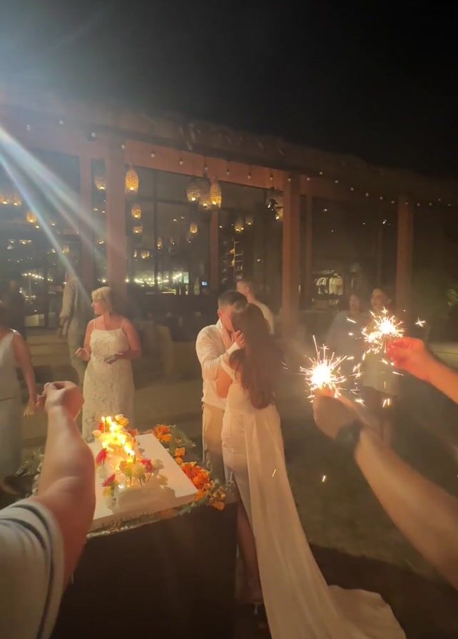A wedding celebration at night. A bride and groom kiss in front of a cake with lit candles, surrounded by guests. Several guests hold sparklers. The background includes outdoor lighting and a building with large windows. The mood appears joyous.