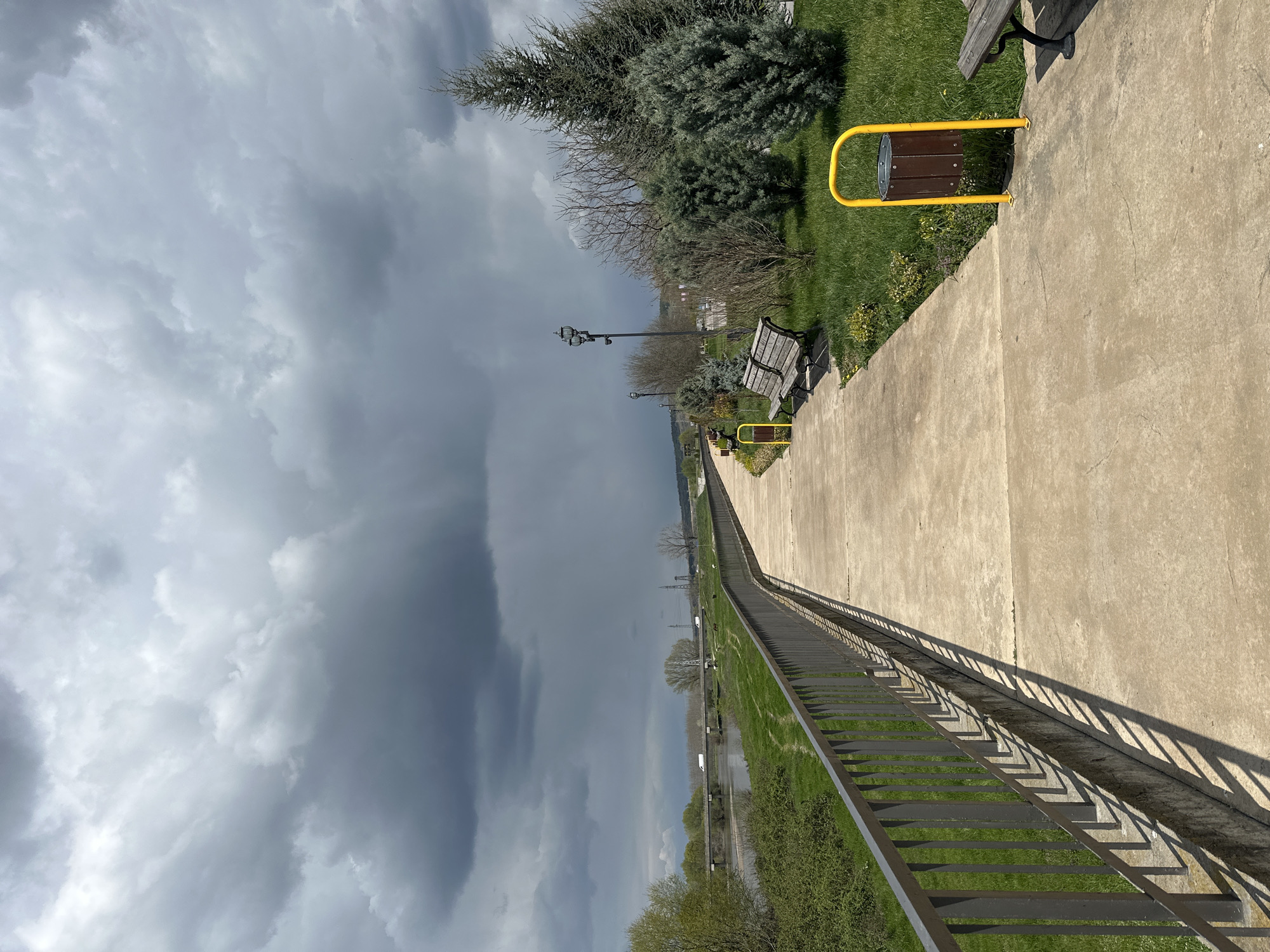 The image depicts a concrete pathway with a metal railing in Svilengrad, Bulgaria. The pathway runs parallel to a river or canal bordered by green grass and trees. A row of benches and vintage lampposts lines the path. The sky is overcast with heavy, dark clouds.