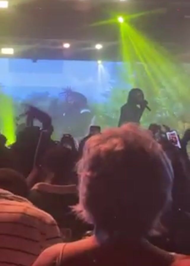 A crowded indoor concert venue shows a performer on stage backlit with green and white spotlights