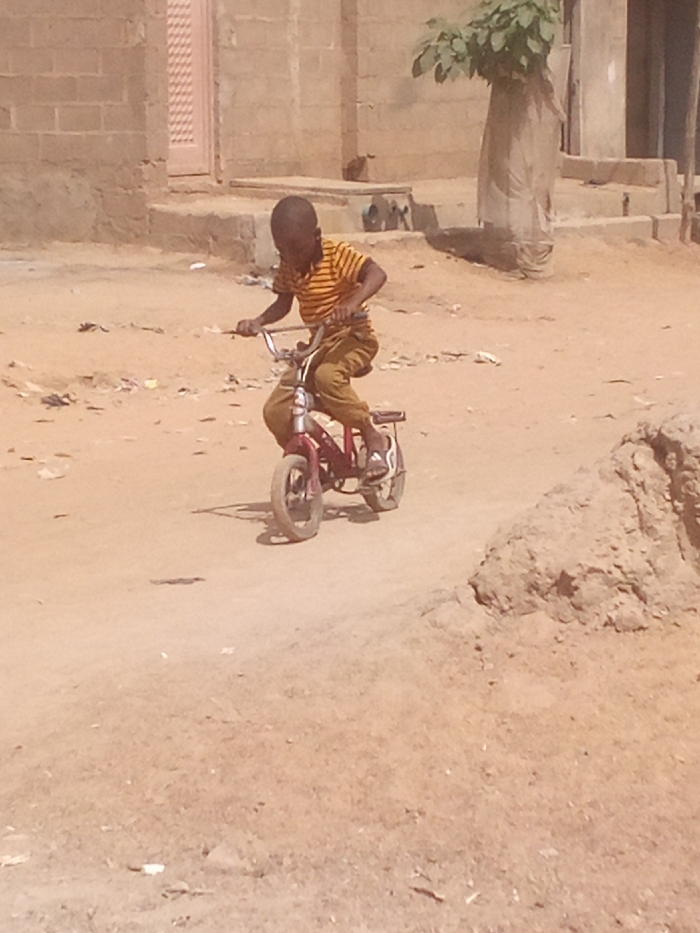 - "An outdoor scene in Rangaza, Nigeria, shows a young, dark-skinned child actively riding a small, red two-wheeled bicycle on an unpaved dirt path" by FM-n9KFH2, licensed under CC BY 4.0