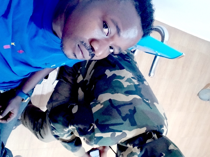 The image, described as being located in Gweta, Botswana, features two individuals positioned indoors. In the foreground, a dark-skinned male with short dark curly hair, a graying mustache, and a short beard is seen looking directly toward the viewer. He wears a blue t-shirt with small, multi-colored abstract designs on the chest and a blue watch on his left wrist. Behind and to the right of the foreground individual, a second person is partially visible from the back and side, wearing a hooded camouflage jacket and dark trousers. This individual is seated, looking downwards, and holding a smartphone in their right hand. A light blue chair with silver-colored metal legs is partially visible between the two subjects. The floor is light-colored with a wood-grain pattern, and a plain light-colored wall is visible on the left. A small, light-colored circular object rests on the floor in the upper right background.