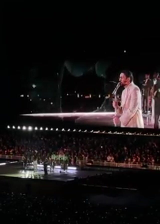 A large indoor venue is mostly dark, with a large screen displaying a close-up of a man in a white suit and sunglasses, singing into a microphone