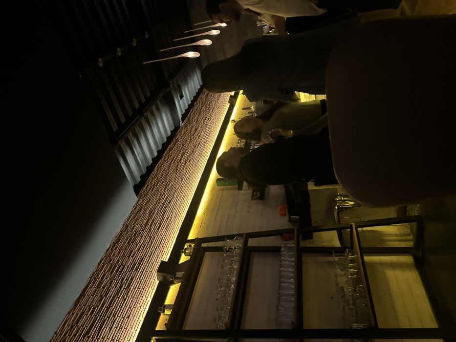 A bar scene captured with a low-angle shot features a wall adorned with elongated, cylindrical lights. Patrons stand along the illuminated bar, their forms partially obscuring the view. Underneath, glass racks hold rows of stemware. The lighting casts an amber glow, enhancing the bar's ambiance, and a corrugated ceiling adds an industrial touch.