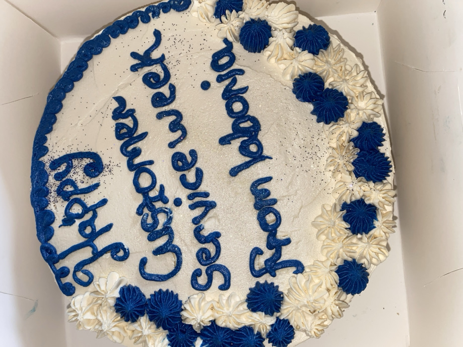 A round cake with white frosting is observed within a white cardboard box. The cake's top surface is inscribed with "Happy Customer Service week From laborja" in blue piped frosting, enhanced by silver glitter-like specks. The perimeter of the cake features alternating piped rosettes of white and royal blue frosting. The scene is located in Hotoro South, Nigeria. No individuals are present.