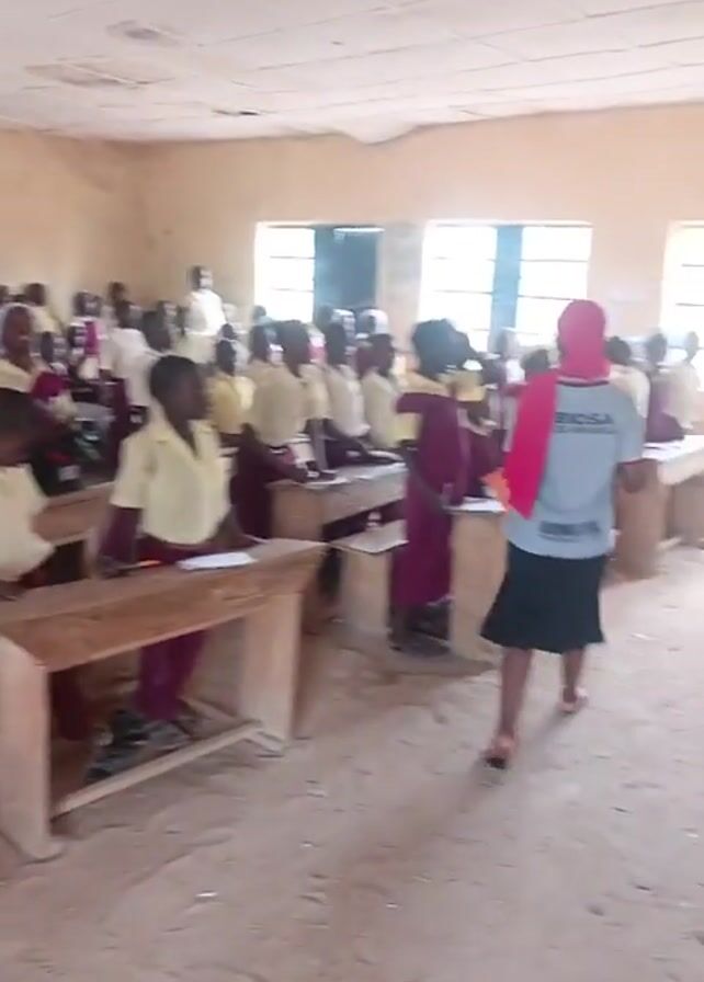 This video shows the inside of a classroom full of students. The classroom looks old. The walls are a neutral color and the floor is dirt. There are many wooden desks and benches in neat rows. The students are young, mostly dark-skinned, and wearing school uniforms in maroon and khaki. Many of the students stand at their desks. A person wearing a t-shirt and hijab walks towards the camera. The students are speaking loudly.