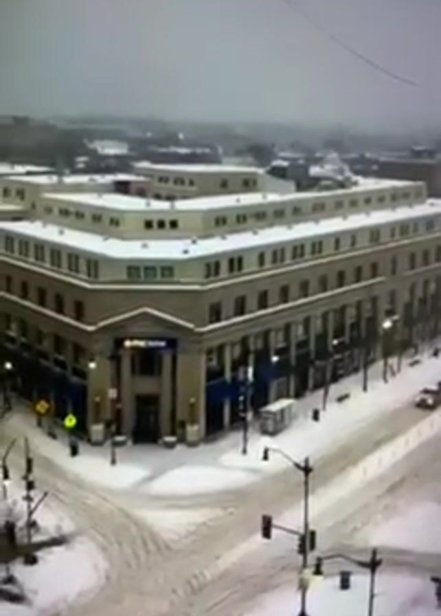 n aerial shot of an intersection in a city covered in snow. The focal point is a PNC Bank building on the corner, its roof, signage, and the surrounding streets blanketed in white. There is light vehicle traffic in the snowy conditions. Traffic lights are visible, and the sky is overcast.