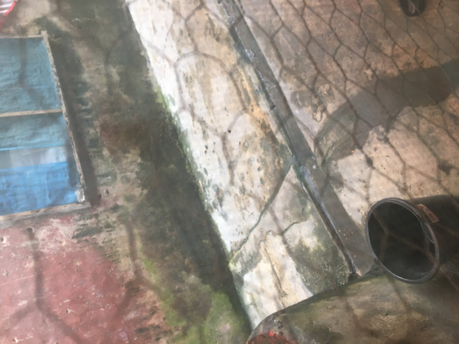 The image displays an exterior scene in Ojo, Nigeria, observed through a wire mesh screen in the foreground. The upper left features a wall, partially painted in a faded reddish hue, exhibiting significant dark green biological growth and moisture staining. A rectangular window, framed in dark material, is visible in the upper center, with its opening covered by a light blue mesh fabric. The ground consists of uneven concrete paving stones, crisscrossed by cracks and mottled with dark stains and green organic growth. A narrow, linear concrete drainage channel runs across the mid-ground. In the lower-left quadrant, a dark-colored plastic bucket with a red label is situated on the pavement near a low, weathered concrete structure. A single dark-colored sandal rests on the paved ground in the lower right. A distinct shadow, suggestive of a human figure, is cast across the lower-right paved area. No individuals are directly visible.