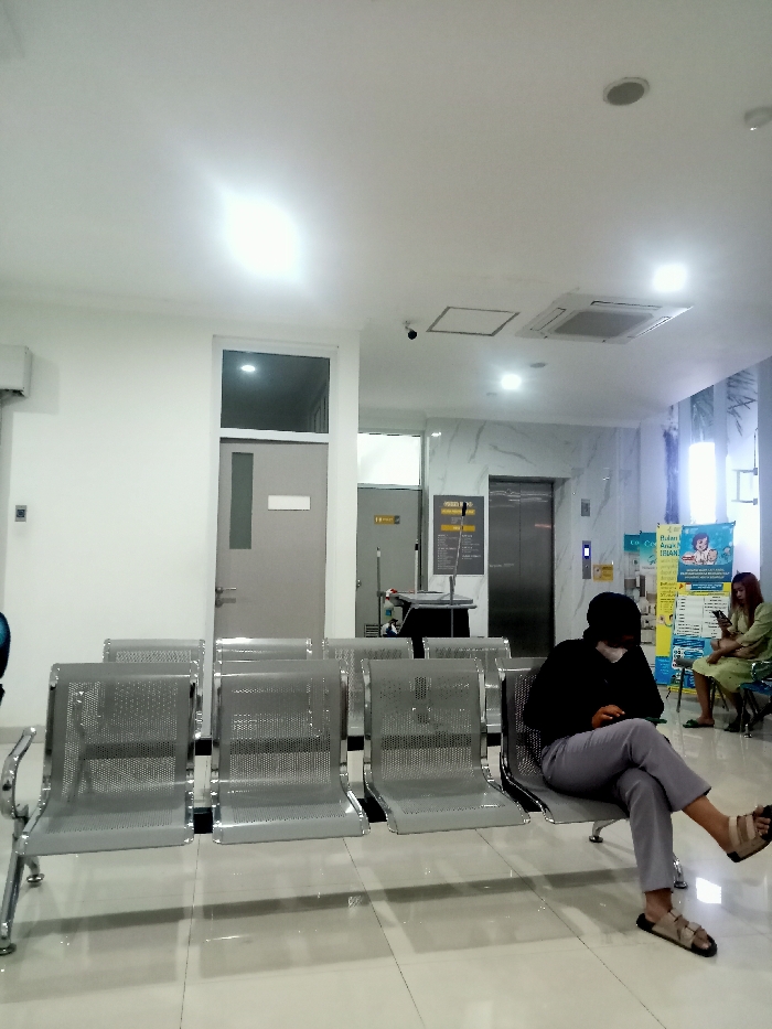 The image depicts a well-lit indoor waiting area, likely within a medical facility or office building, located in Unknown, Unknown. The flooring is composed of light-colored, reflective tiles. Walls are predominantly white, with sections featuring white marble-patterned paneling. The white ceiling contains recessed lighting fixtures, an air conditioning unit, and a black dome-shaped security camera (CCTV). In the foreground, a row of metallic waiting chairs with perforated grey seats and chrome frames extends across the frame, with one individual seated towards the right. This person wears a black long-sleeved top, light grey pants, and brown slip-on sandals. Their head is obscured by a dark hood or shadow, but a white face mask is visible. They appear to be looking downwards. In the mid-ground, a second individual with long brown hair, wearing a light-colored dress, is seated on a similar waiting chair on the far right, observing a mobile phone. The background features several architectural elements: a grey door with a rectangular window and a horizontal panel to the left, and another grey door with a smaller window and a cleaning or utility cart parked beside it. A metallic elevator door is centrally located. Adjacent to the elevator, a dark-framed poster with yellow text, possibly titled "PENTING!" (Important!), is displayed. To the far right, a blue and white banner with an image of a child advertises "Co. Care Irian," indicating a potential pediatric or child-focused service.