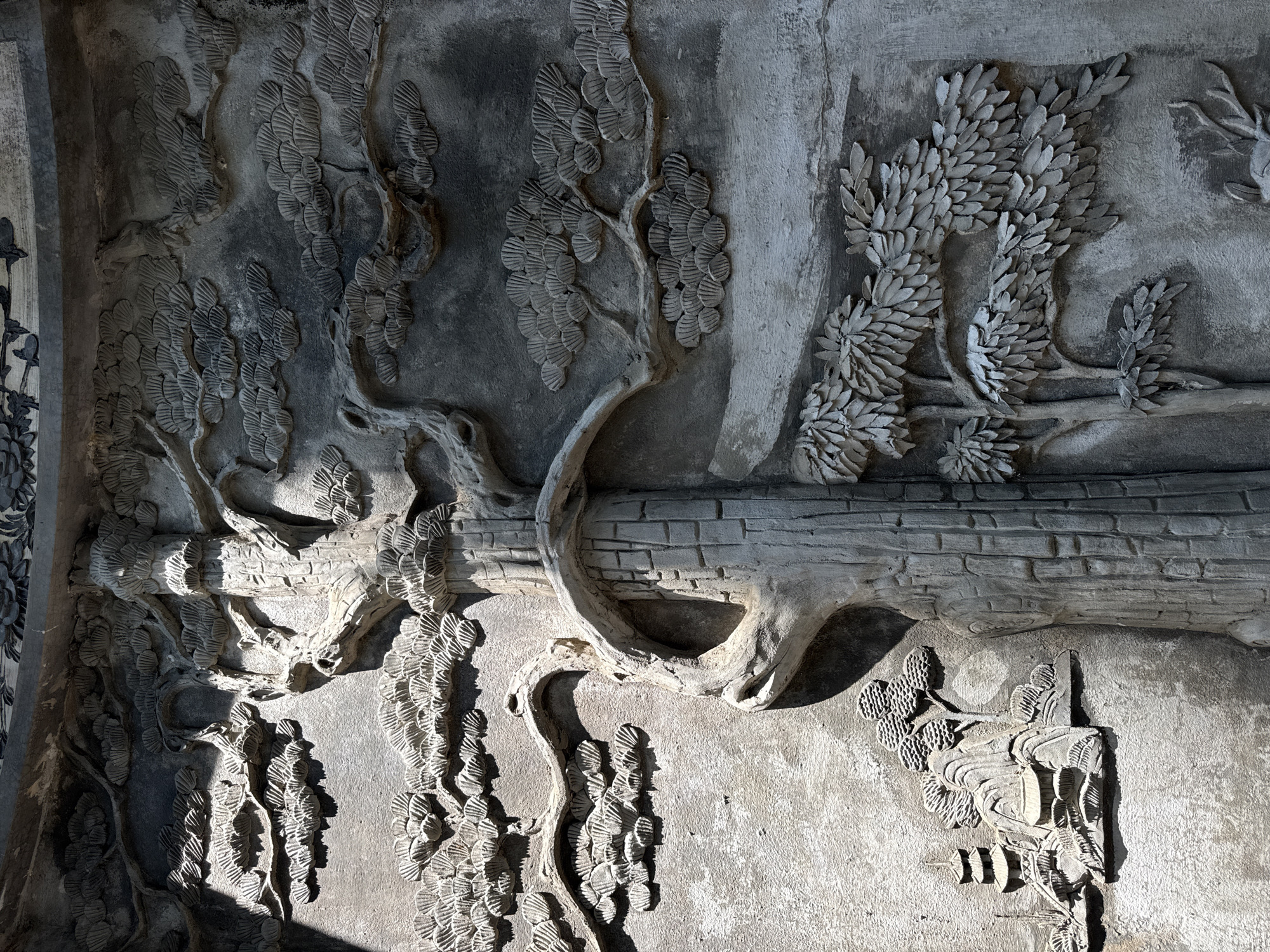A detailed, weathered bas-relief carving on a gray stone or concrete wall is depicted, located within the Marble Mountains complex in Đà Nẵng, Vietnam. The central feature is a large, gnarled tree, resembling a pine or cypress, exhibiting a textured trunk and dense, fan-shaped foliage rendered in high relief. To the left of the main tree, a smaller, recessed landscape scene features stylized mountains, a multi-tiered pagoda, and smaller trees. The lower right section of the carving includes additional foliage and the partial depiction of an animal, identifiable by antlers and a head consistent with a deer. The entire carving displays signs of age and weathering. Strong, directional sunlight from the upper left casts deep shadows, accentuating the three-dimensional qualities and intricate details of the relief. No individuals are present in the scene.