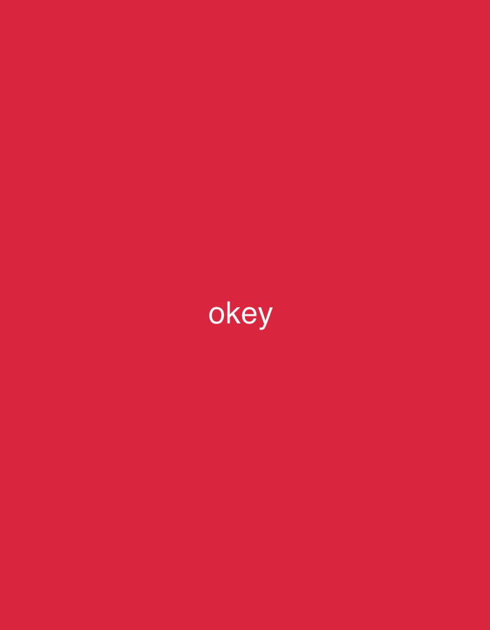 The image displays a solid, uniform red field. The word "okey" is rendered in white, lowercase letters and positioned centrally within this red field. There are no individuals, discernible objects beyond the text, specific actions, or interactions present in the image. The environment is abstract, characterized solely by the monochromatic red background and white text. As specified, the scene is contextually located in Aytos, Bulgaria.