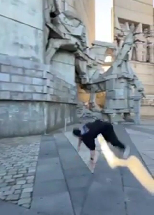 A person wearing black clothing performs a parkour move in an outdoor urban setting. The person runs, vaults off a surface, and lands on the ground. The surroundings feature tall, modern stone monuments or sculptures. The area is paved with stone and appears to be a public square or plaza. The sky is visible in the background.