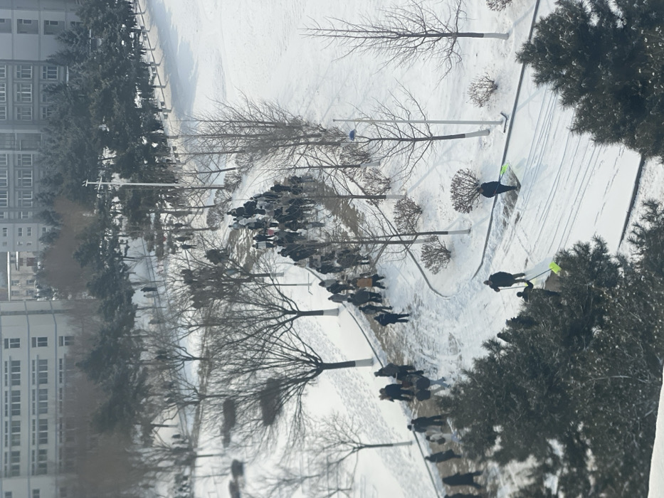 The image depicts an outdoor winter scene in the city of Zhongtun, China, characterized by extensive snow cover across a campus-like environment