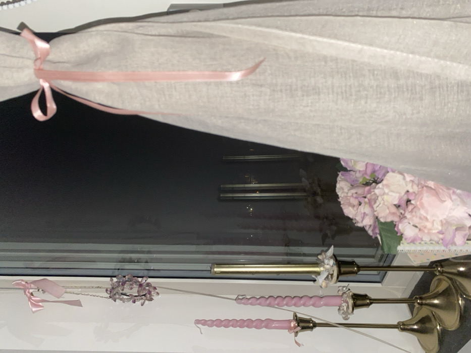 A dimly lit scene showcases a window draped with a light-colored curtain tied with a pink ribbon