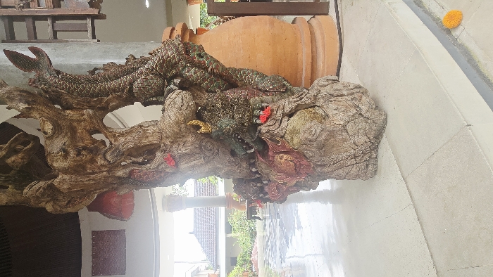An intricate dragon sculpture, textured with scales and painted with reds, greens, and golds, rests on a gnarled, weathered wooden base