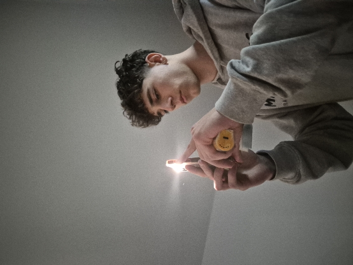 A young male, consistent with late adolescence or early adulthood, is depicted indoors in Bragança, Portugal. He possesses short, dark, curly hair with tapered sides and is wearing a grey hooded sweatshirt. A silver stud earring is visible in his left ear. He is oriented in a three-quarter profile, with his head inclined downwards, his attention directed towards the objects he manipulates. His left hand is elevated, holding a dark-colored smartphone vertically. The phone's screen is brightly illuminated, serving as the primary light source for the immediate foreground and producing discernible lens flare. His right hand is positioned below the left, gripping a yellow, circular object, possibly a retractable measuring tape, which displays a black smiley-face motif on its outward-facing surface. The background consists of undecorated, light-colored walls and a ceiling.