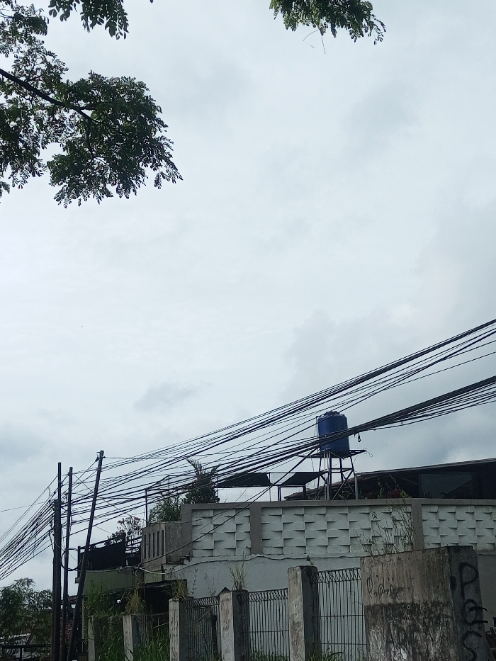 A low-angle shot reveals a cloudy sky above a building. The building features a patterned wall and a water tank on its roof, supported by a metal frame. Overhanging power lines crisscross the sky, adding complexity to the composition. Vegetation peeks over the wall, softening the urban scene. A foreground fence, marked with graffiti, leads to the building. Framing the top left corner is a tree branch with green leaves.
