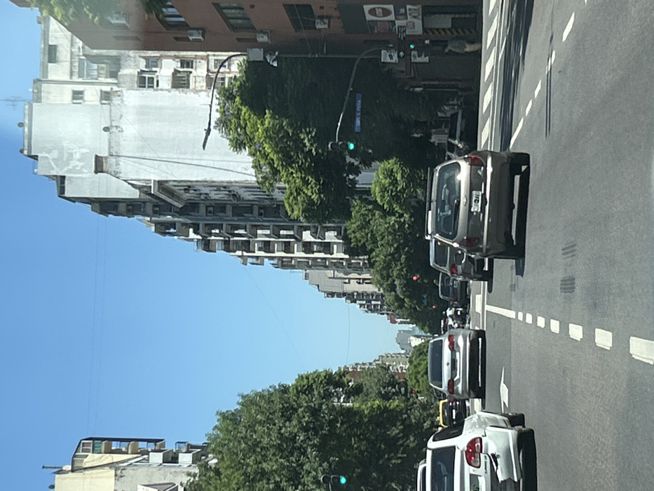 An eye-level view of a city street shows several cars in the right lane, with dashed lines dividing lanes. Buildings line both sides of the street, interspersed with trees. The sky is clear and blue. A green traffic light is visible on the left. Buildings are tall with similar architectural features.