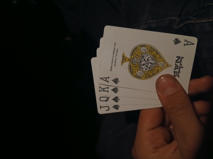 - "A close-up image depicts a human hand holding four playing cards fanned out against a dark, blurred background with visible dark blue fabric, likely denim" by FM-JsuIA2, licensed under CC BY 4.0