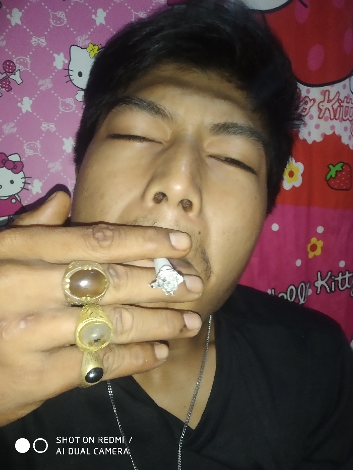 A close-up image depicts an adult individual, identified as male, with medium skin tone, dark hair, and closed or squinted eyes, holding a lit cigarette to his mouth. He wears a black t-shirt and a silver-colored chain. His left hand, holding the cigarette between the index and middle fingers, displays three rings: a gold-toned ring with an amber oval stone on the index finger, a gold-toned ring with a translucent white irregular stone on the middle finger, and a gold-toned ring with a dark oval stone on the ring finger. The cigarette's tip is actively burning, showing embers and ash, with a crinkled, foil-like material near the tip. The background is a pink fabric or wallpaper patterned with Hello Kitty characters, strawberries, and flowers. The scene is consistent with an indoor setting. While the user specifies the location as Cipinang, Indonesia, this cannot be independently verified from the visual information within the image. A "SHOT ON REDMI 7 AI DUAL CAMERA" watermark is visible in the lower-left corner.