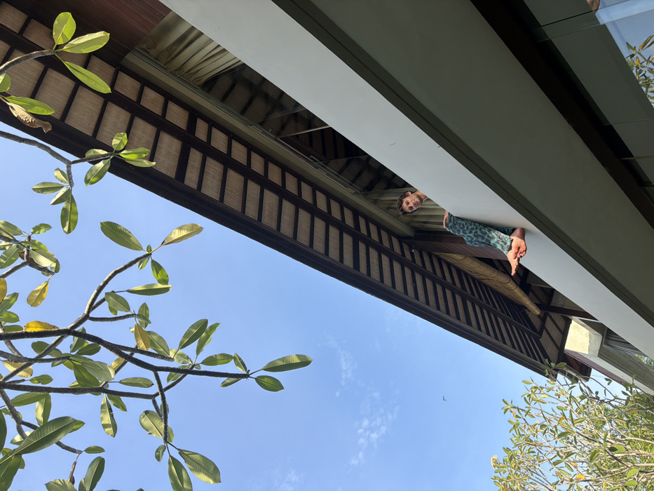 A male individual is observed on an upper level of a multi-story building in Ungasan, Indonesia. He is seated on the exterior edge of a light-grey concrete balcony, with his torso and head visible above the railing. His bare left foot is extended downwards over the balcony edge, and he is wearing teal and black patterned trousers. The man is looking directly forward. The building displays a modern architectural style with traditional Indonesian elements, featuring dark brown wooden beams and a light-colored, possibly woven, soffit beneath the roofline. Large glass windows or sliding doors are visible behind him. The upper portion of the scene consists of a clear blue sky, partially framed on the left by the lush green foliage of an overhead tree branch.