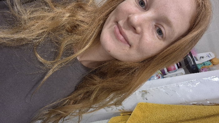 The image depicts an adult female subject positioned in a bathroom setting within the city of Chaikovsky, Russia. The individual has fair skin with visible freckles, blue eyes, and long, wavy reddish-blonde hair. Her gaze is directed forward, and she exhibits a slight, closed-mouth smile. She is dressed in a dark grey casual top. The background features a yellow bath towel hanging vertically to the right, adjacent to a translucent white shower curtain with an embossed pattern. A shower caddy or shelf is mounted on the wall behind the subject, displaying various personal care items including bottles from brands like Dove, and a pink loofah.