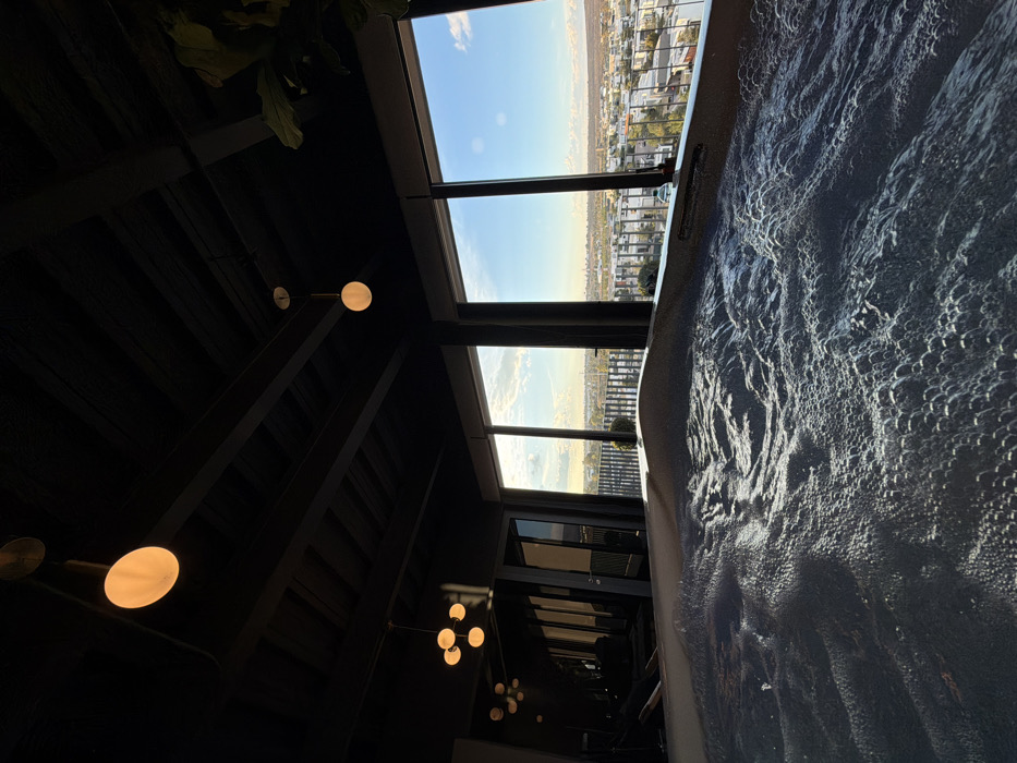 A modern interior showcases an open window framing a cityscape. A dark, slatted ceiling with globe light fixtures contrasts with the bright outdoor view. A jacuzzi fills the right side of the image, its water surface shimmering. The scene is taken from a low angle, emphasizing the height and depth of the space.
