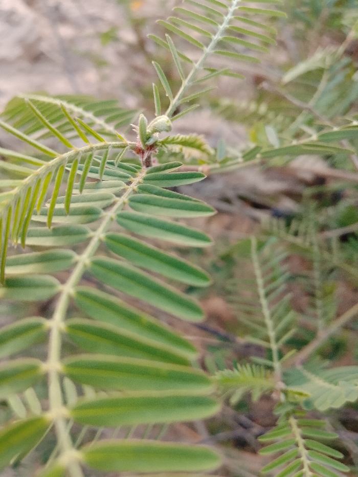 A close-up vertical photograph captures a section of a green plant, observed in Narayi, Nigeria. The foreground is dominated by a plant stem with multiple pinnately compound leaves, each composed of numerous small, ovoid, light to medium green leaflets. A nascent apical bud, pale green with a reddish-brown base, is centrally located on an upper stem. The background is significantly blurred, presenting indistinct brown and lighter beige tones consistent with natural earth or defocussed vegetation. No human or animal subjects are present. No artificial structures are discernible.
