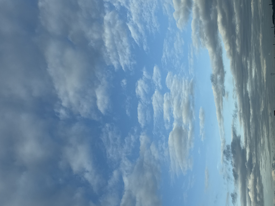 The image depicts the sky above Wolfisheim, France. The scene is dominated by cloud formations against a blue sky background. The upper two-thirds of the frame show a partially clear blue sky interspersed with scattered white to light grey cumulus and altocumulus clouds, some arranged in horizontal bands. The lower third of the image is characterized by a dense, continuous layer of darker grey stratocumulus clouds that extends to the bottom edge. No individuals, overt actions, or direct interactions are discernible. At the extreme bottom, faint, dark, indistinct silhouettes are visible, suggesting distant ground-level structures, including a possible utility pole-like element on the far right.