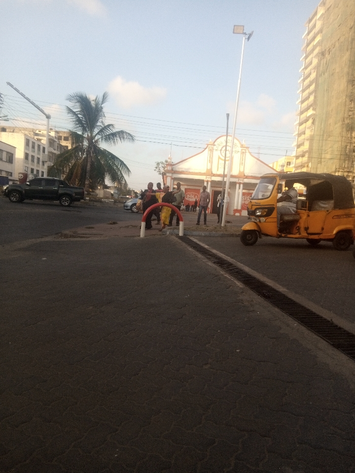 The image captures an urban street scene in Ganjoni/Shimanzi ward, Kenya, under bright daylight. The foreground features an asphalt road exhibiting minor surface cracking, with a metal drainage grate running along its right edge. In the mid-ground, a group of approximately eight to ten individuals, dressed in casual clothing, are clustered near a red and white U-shaped barrier on a paved area adjacent to the road. One person within this group wears a yellow patterned garment. To the immediate right, a yellow three-wheeled auto-rickshaw, commonly known as a tuk-tuk, with a black canvas canopy, is positioned on the road. A male individual occupies the driver's seat. A tall, slender silver street light pole with an LED fixture extends vertically behind the tuk-tuk. On the left side of the road, a dark-colored four-door pickup truck is visible, either stationary or in slow motion. Partially obscured behind the central group of people is a light-colored sedan. A prominent palm tree with green fronds stands between the left-side buildings and the central activity. The background features several structures. Dominating the center-right is a distinctive building with a white and light brown/orange facade, characterized by an ornate arched entrance and a sign partially visible, reading "BU SAGA." To the far right, a tall, multi-story building under construction is enveloped in green scaffolding netting. On the far left, multiple multi-story buildings are visible, with a construction crane extending above one of them.