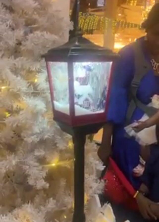 Christmas-themed scene. The focus is a black, red, and clear Christmas lantern with a snowy scene inside. Fake snow is swirling within the lantern. To the left is a white Christmas tree adorned with yellow fairy lights. To the right, an adult in a blue dress and black hat holds a baby. Another person is also visible. The background features blurry lights.