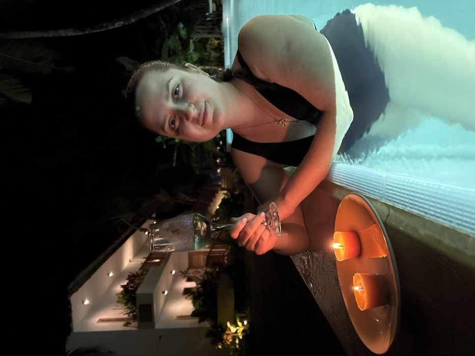 A woman wearing a black swimsuit is partially submerged in a pool, her arms resting on the edge. She holds a stemmed glass, presumably filled with a beverage. A lit plate with two candles sits beside her on the pool's edge. The background reveals a dark night sky and a building with lights emanating from its windows and garden below. The setting suggests a serene, possibly romantic, nighttime poolside scene.