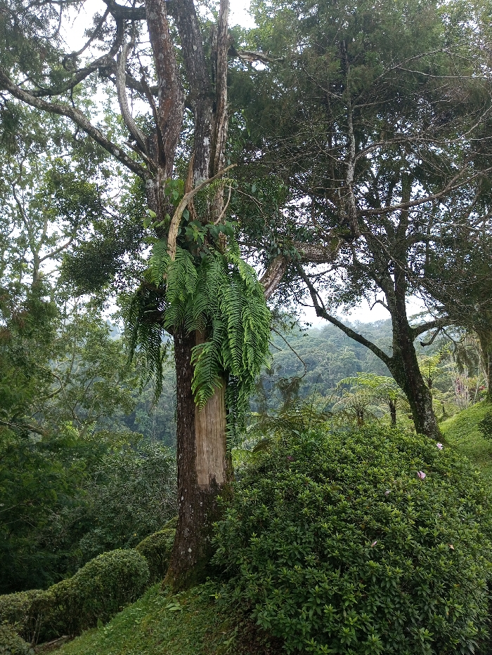 This image depicts a lush, verdant forested area in New Serchhip, India. The foreground is dominated by the trunk of a large, mature tree with rough, dark bark. A significant section of the tree's bark is stripped away on the left side, exposing lighter, smoother wood underneath. Several large, green ferns with long, frond-like leaves hang vertically from a branch or growth near the exposed section of the tree trunk. Other vines and smaller green plants are also visible growing on the tree. To the right and behind the central tree, another large tree with numerous branches and less dense foliage is visible. The lower half of the frame features a dense undergrowth of various green bushes and smaller plants, forming a natural, uneven ground cover. In the middle ground, a valley or depression filled with thick, green forest foliage extends into the distance. The background reveals multiple layers of forested hills under an overcast or hazy sky. No people, animals, or artificial structures are discernible within the frame. The overall scene is natural and wild, characterized by dense vegetation and a hilly terrain.