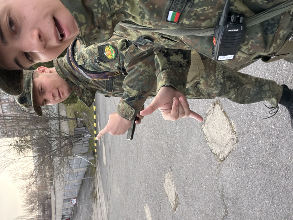 The image depicts two males in Bulgarian military camouflage uniforms posing outdoors in what appears to be a military or industrial zone in Sofia, Bulgaria
