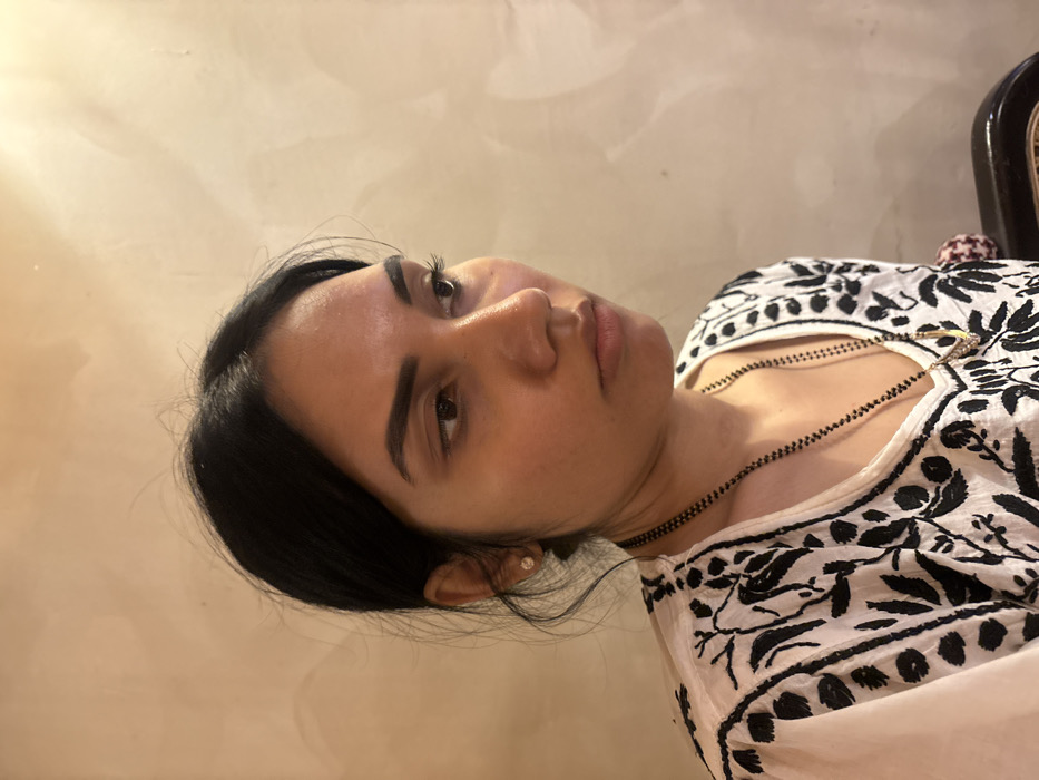 An indoor, close-up photograph displays a single female individual, viewed from the chest up, positioned facing the right side of the frame. The individual possesses dark hair, parted centrally and pulled back, dark brown eyes, and a medium skin tone. A small, circular, light-colored stud earring is present in her visible left ear. She is wearing a white garment featuring black embroidered or printed patterns, likely floral or abstract, covering her upper body, with a V-neckline. A long necklace, composed of numerous small black beads culminating in a gold-colored pendant, is worn around her neck. Her facial expression is neutral. The background consists of a light brown or beige wall with a textured, possibly painted or stucco, finish. A dark, possibly wooden, armrest of a chair with a decorative element is partially visible in the lower right foreground. The specific location within the city of Howrah, India, cannot be determined from the visual evidence provided.