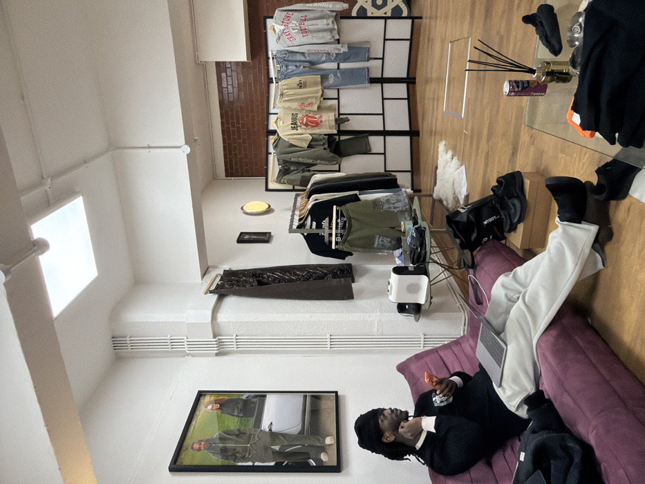 An indoor scene in a commercial space, likely a retail store or showroom, in the city of London, United Kingdom, is captured from a slightly elevated perspective. The room features white walls, a light brown wooden floor, and an exposed white ceiling with conduit and a square skylight or recessed lighting fixture. A section of exposed red brick wall is visible on the right. One adult male is seated on a large, plum-colored, segmented lounge chair positioned on the left side of the frame. He has dark skin, dreadlocks covered by a black headwrap, and wears a dark long-sleeved shirt with a white collar and a graphic on the chest, paired with light grey sweatpants. He holds an orange-cased smartphone in his right hand, looking at its screen, while his left hand rests near his chin. An open silver laptop is balanced on his lap. Beside him on the floor, a black duffel bag rests, and two pairs of black sneakers are placed, one pair on a brown shoebox. Against the left wall, a large, vertically oriented framed photograph depicts a man in a green utility suit standing next to a silver vehicle, with a woman partially visible behind the vehicle. Further right, a white-painted column features vertical pipework. In the mid-ground, a small, round green side table holds a white portable speaker/heater unit, a dark bag, and other small items. A white, fluffy rug lies on the floor nearby. To the right, a clothing display area is set up with a black and white folding room divider acting as a backdrop. Various garments are displayed on hangers and draped: a dark green hoodie, a tan hoodie with "JEANIUS" and a Rolling Stones logo, green cargo shorts, two pairs of blue distressed jeans, and a grey "CRAYSTONE FOOTBALL" sweatshirt. In the foreground, on the right, a clear glass coffee table holds a purple and silver beverage can, a glass diffuser bottle with black reeds, and several folded dark clothing items with visible orange tags.