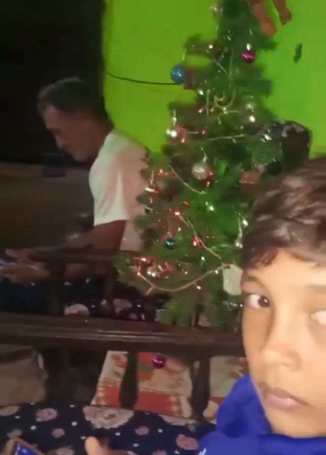 The video begins with a medium shot of two men sitting in chairs outside. The first man is seated, looking at his phone, and the second man is turning around to look at the camera. There is a Christmas tree to the right, a green wall behind the man, and a dark area beyond the patio. The camera then moves inside where other people are sitting in chairs. The focus shifts to a woman with dark skin wearing a pink blazer. She is looking at her phone. An older woman is sitting in a chair behind her. The setting appears to be someone's home.