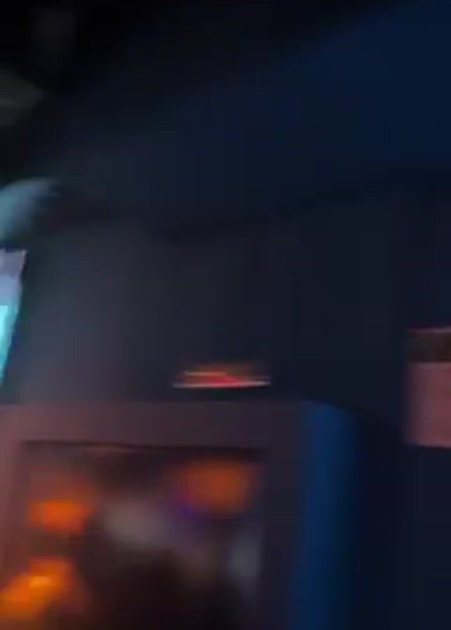 The video starts with a close-up of a blue neon sign resembling a cocktail shaker on a blue wall. The camera then moves to reveal the interior of a crowded nightclub or bar. People are visible milling around, with a bar in the background stocked with bottles. The ceiling is dark with various lights including orange, green, and blue, creating a lively atmosphere. A screen displays visuals, although the content is unclear. As the camera angle shifts, the full extent of the crowd becomes apparent, with many people gathered in a central area. The scene is dynamic and energetic, characteristic of a bustling nightlife venue.