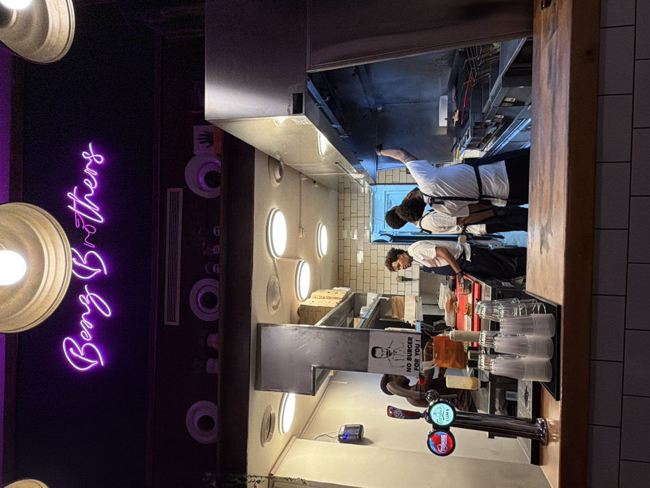 This image depicts the interior of the Benz Brothers burger restaurant, located on Lilienblum Street in Tel Aviv, Israel