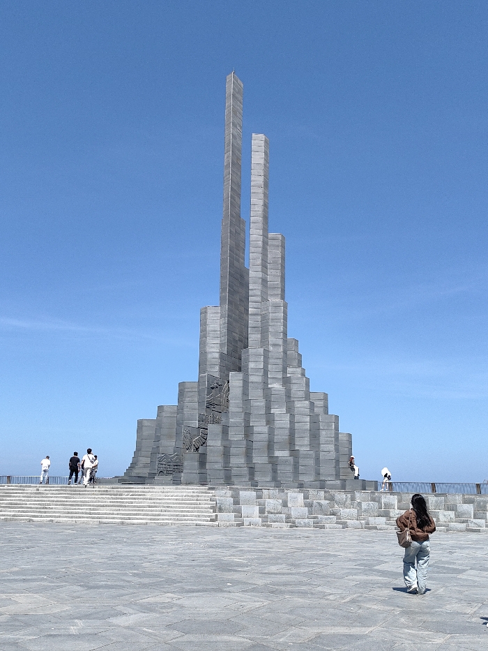 The image depicts the Nghinh Phong Tower in Thành phố Tuy Hòa, Vietnam, under a clear blue sky. The tower is a prominent, multi-tiered structure constructed from grey, rectangular blocks, forming a tapering base that ascends into several tall, rectangular spires. Relief carvings are visible on the lower sections of the monument. A spacious, grey paved plaza occupies the foreground, leading to wide, grey stone steps that access the tower's base. Seven individuals are present. In the foreground, a female with long dark hair, wearing a brown jacket, light blue jeans, and carrying a light shoulder bag, walks away from the camera towards the monument. To the left of the monument, a group of four people stands near a dark metal railing, observing the vista. Two additional individuals are on the right side of the monument: one in red clothing is seated on a lower stone block, and another in white attire is standing near the railing. The scene is brightly lit by direct sunlight.