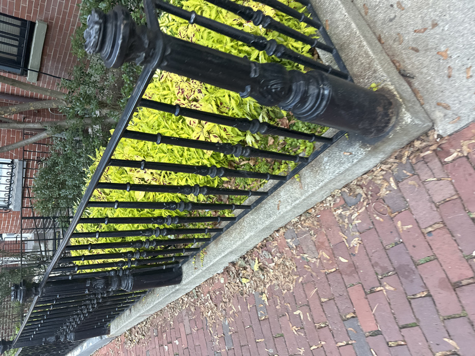 The scene depicts a street-level view within a historic residential area of Boston, United States, likely in neighborhoods such as Beacon Hill or Back Bay. In the foreground, a reddish-brown brick sidewalk is partially covered with scattered dry leaves. Parallel to the sidewalk, a black wrought-iron fence with ornamental vertical pickets and decorative finials is mounted on a light gray concrete or stone curb. Behind the fence, a garden bed contains a dense planting of bright green and yellow variegated foliage. In the background, a red brick building with dark window frames is partially visible, alongside a slender tree and various green shrubs. No individuals or dynamic actions are present.