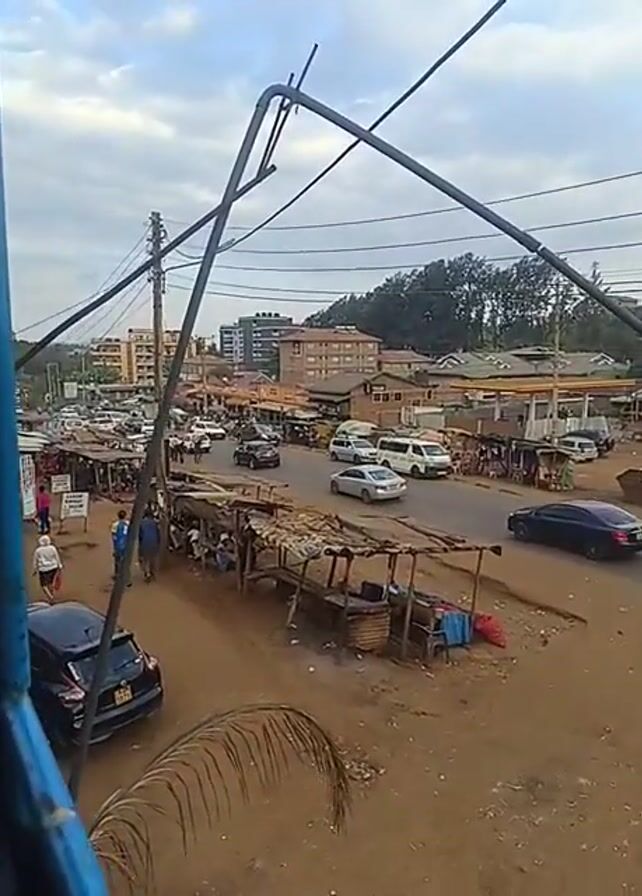 street scene in what appears to be a developing country. The viewpoint is from an elevated position, possibly a building. The street is dirt and lined with small, makeshift structures that appear to be shops or stalls. Several people are visible, some standing around and others sitting under umbrellas. There is a fair amount of vehicular traffic, including cars, vans, and other vehicles. In the background, there are buildings of varying sizes and heights, as well as trees. Overhead, there are numerous power lines. The sky is cloudy. Overall, the scene depicts a typical busy street in a less developed area.