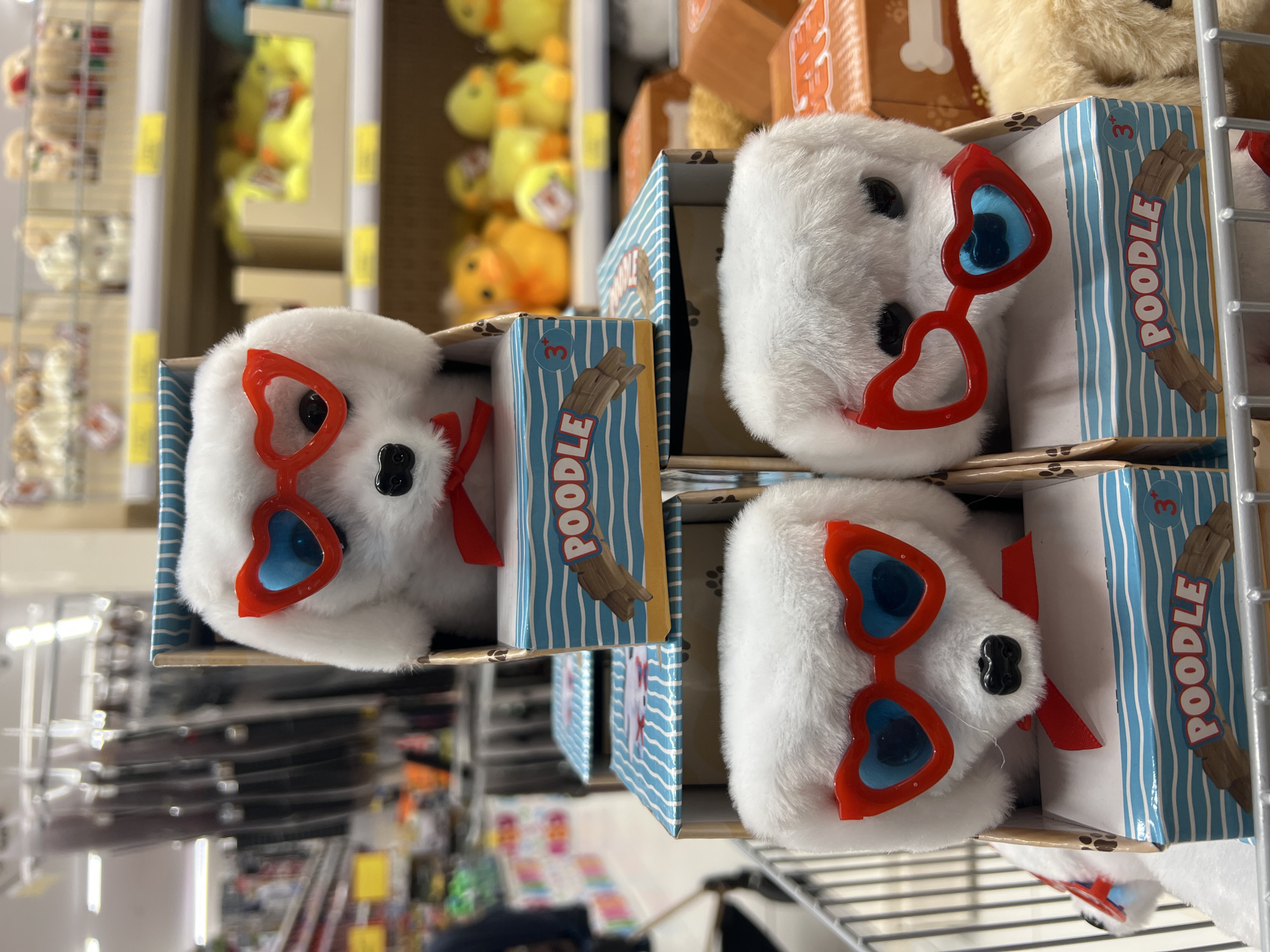 The image displays three white plush toy poodles, each equipped with red heart-shaped sunglasses featuring blue lenses and a red neck bow, positioned within a retail store in Dub, Montenegro. The poodles are individually contained in blue and white striped cardboard boxes, each bearing the text "POODLE," a bone graphic, and the age suitability "3+". These boxed toys are stacked vertically inside a metal wire shopping cart, with one poodle prominent at the top, another in the middle, and a third partially visible at the bottom. The background, blurred, reveals multiple retail shelving units stocked with various items, including other plush toys, yellow rubber ducks housed in wooden crates, and additional packaged merchandise. Overhead fluorescent lighting illuminates the scene. A partial human figure, dressed in dark attire, is discernible on the far left of the frame.